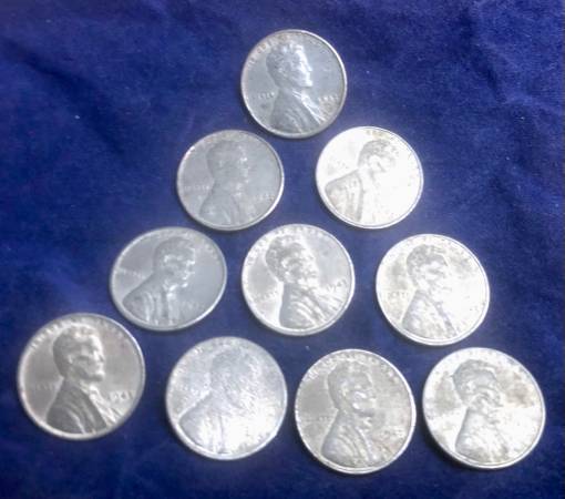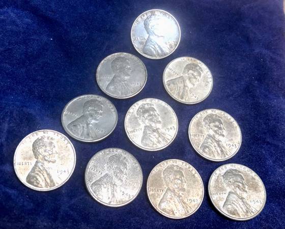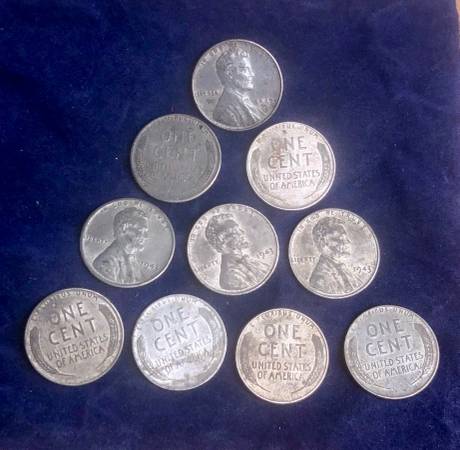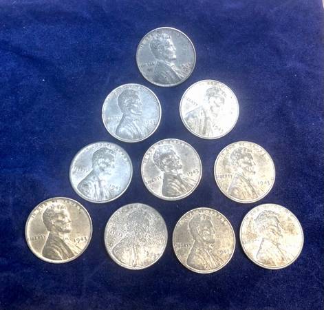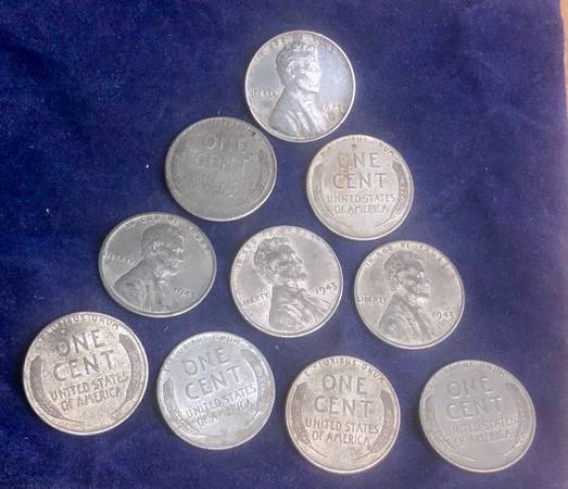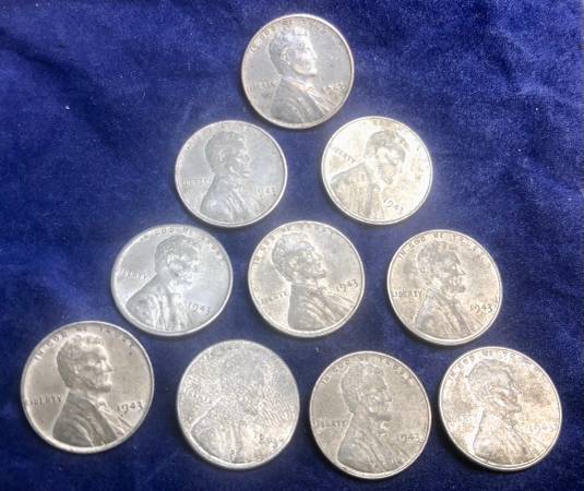 1943 U.S. Lincoln Steel Wheat 1 Cent .01 Penny 10 Pennies 10x coins