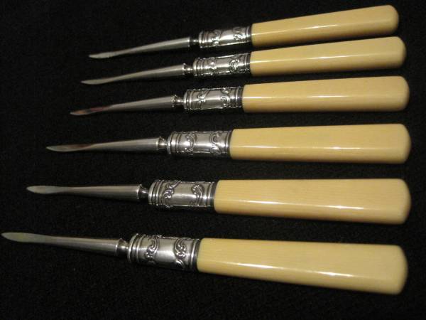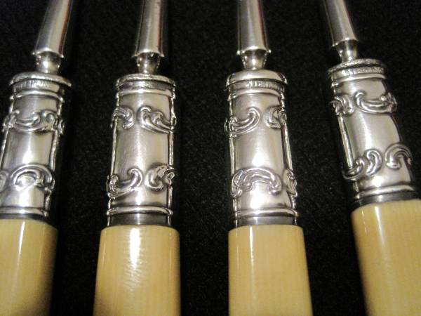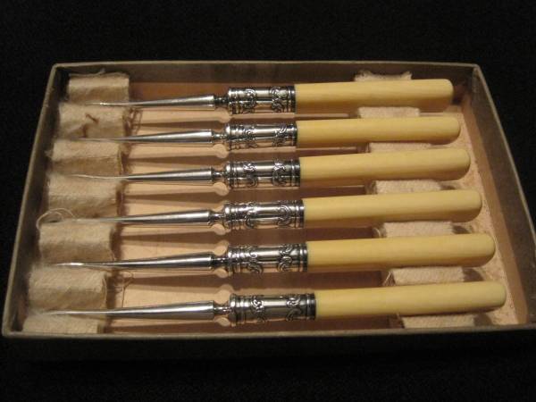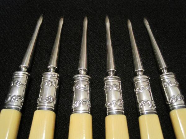 Beautiful set of six antique Sterling silver and faux bone (celluloid) seafood / nut picks in the Art Nouveau style in very good condition with the original box. Each Pick measures 5-1/2" in length. These would be lovely for a dinner party or table setting. During the Victorian, Edwardian eras, how you served a meal was just as important as what you served. Circa 1885 - 1910. The Nouveau decorative band is sterling silver with harder alloy for the spine of the pick.