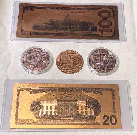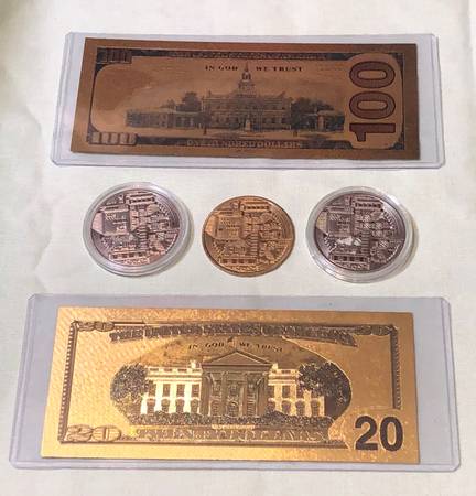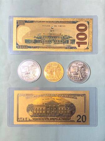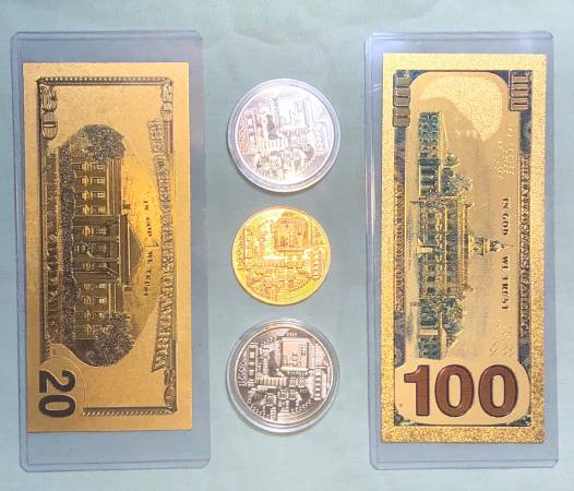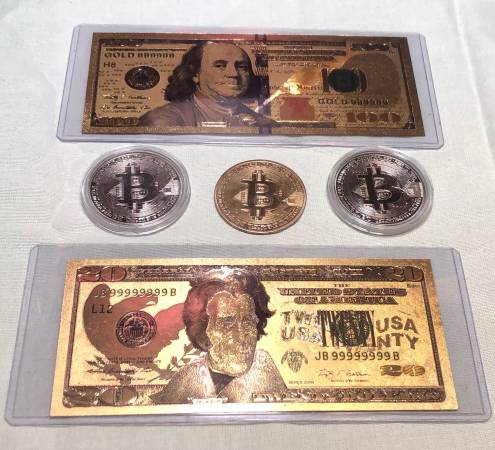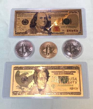 - $100 Golden Hundred (movie money) - $20 Gold Twenty (fake) - 2x Bitcoins silver color - Bitcoin gold $15