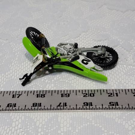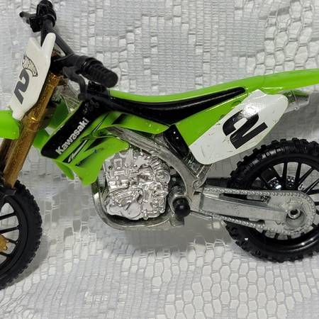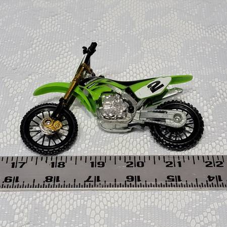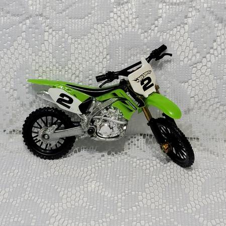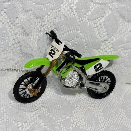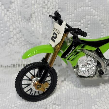 Hot Wheels die-cast dirt bike Kawasaki, green body with white, number 2 plate, and gold-colored front forks.