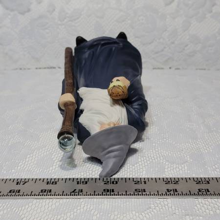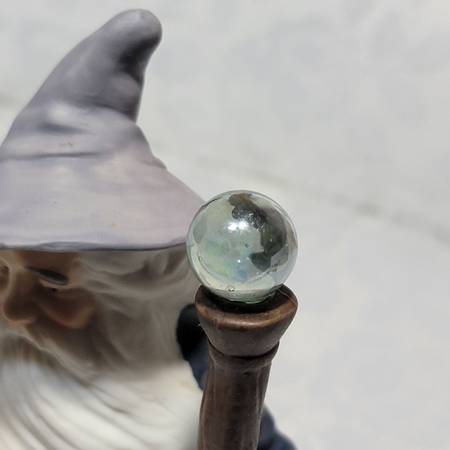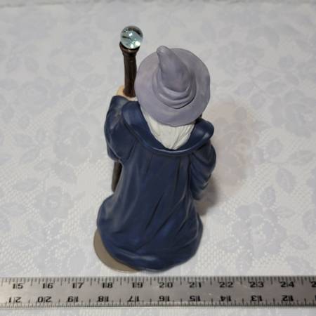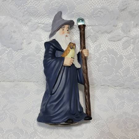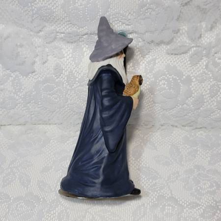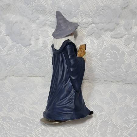 Charming wizard figurine holding an owl and staff. Features a blue robe, gray hat and brown staff with clear glass ball. Bottom of the figurine has markings read as © Mann 1985 Measures ~ 8.5” H x...