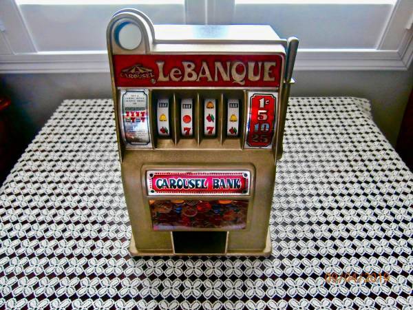 FOR SALE: VINTAGE CAROUSEL "LE BANQUE" SLOT MACHINE BANK. NO COINS NEEDED TO PLAY. IN WORKING CONDITION. NO BATTERIES REQUIRED. Measurements (Approx.): H 10" L 7" W 7.5"