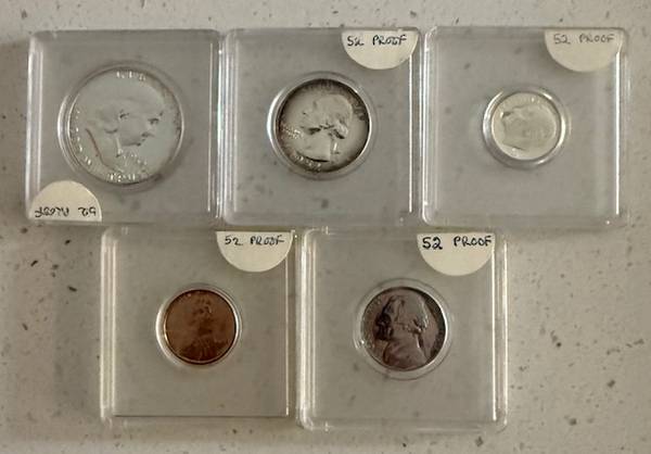 Five-coin set of 1952 proof coins. Some toning on quarter.