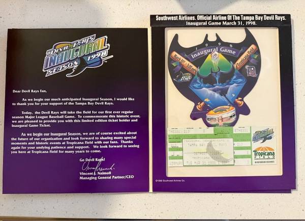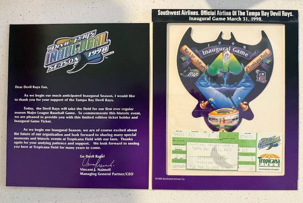 Two tickets to Devil Rays inaugural game on March 31, 1998, at Tropicana Field. Tickets come in nice folder. Also, Inaugural Game Program.