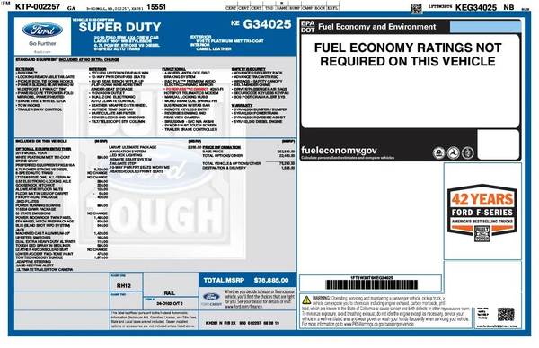 Vehicle OptionsAir Conditioning, Cruise Control, Running Boards, Power Door Locks, Reverse Sensing System, SiriusXM Satellite, Power Steering, Navigation System, Alarm System, SYNC 3, Leather, V8, Turbo Diesel, 6.7 Liter, CD/MP3 (Single Disc), FX4 Off-Road Pkg, Towing Pkg, Bang & Olufsen Premium Sound, 4WD, Dual Power Seats, FordPass Connect, Power Windows, Keyless Entry, Automatic, 6-Spd w/SelectShift, TorqShift & Progressive Range Select, Fog Lights, Cooled Seats, Traction Control, ABS (4-Wheel), Twin Panel Moon Roof, Hill Start Assist Control, LED Headlamps, Tilt & Telescoping Wheel, Daytime Running Lights, AM/FM/HD Radio, Heated Seats, Premium Wheels, Bed Liner, Backup Camera, Blind-Spot Information System, Power Sliding Rear Window, Head Curtain Air Bags, Dual Air Bags, AdvanceTrac, Side Air Bags, Vanity Mirrors, Alarm System, Heated Mirrors, Trip Computer, Windows, CD Player, Luxury Seats, Digital Clock, Center Console, Anti-Theft, Steering Radio Controls, AM/FM, Tilt Steering Wheel, Side Airbags, Compass And Temperature Display, Tow Hooks, Power Mirrors, Reverse Camera, Cruise Control, Power Steering, Clock, Power Driver's Seat, Power Brakes, 2 Hi-Back Bucket Seats, Reclining Seats, Center Arm Rest, Bluetooth, ABS Brakes, Premium Sound, Passenger Airbag, Voice Control, Cup Holders, Voice Activated, Map Lights, USB Port, Dual Air Bags, Driver Airbag, Tire Pressure, Rear Air Conditioning, Security System, Air Conditioning, 12v Power Outlet, Privacy Glass/Tinted, Trip Odometer, Power Windows, Satellite Radio, Power Locks, Digital Instruments, Locking Tailgate, Premium Wheels, FAST- KEY entry system, Homelink System, Dual Power Seats, Rear-Side Airbags, Premium Alloy Wheels, Fog Lights, Running Boards, Touch Screen, Body Side Moldings, Navigation System, Power Adjustable Pedals, Subwoofer, Sunroof, Daytime Running Lights, Dual Exhaust, 115V Power Outlet, Chrome Wheels, Dual Zone Climate Control, Air Conditioned Seats, Tow Package, Clearcoat Paint, Traction Control, Panoramic Roof, Remote Start, Exterior Keypad Entry, Metallic Paint, Telescoping Steering Wheel, Leather Steering Wheel, Sliding Rear Window, Auto Climate Control, Heated Seats, Digital Info Center, Front Heated Seats, Bedliner, Memory Seat Position, Keyless Entry, HD Radio and much, much more!!