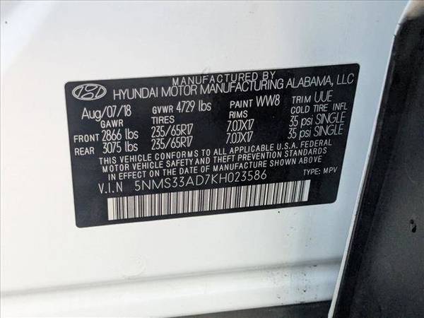 * Carpeted Floor Mats * Lane Keeping Assist * Keyless Start * Rear Spoiler * Black/Beige; Stain-Resistant Cloth Seating Surfaces * Option Group 01 * Quartz WhiteThis vehicle includes a Money-Back Guarantee* and passed our precise inspection process. Best of all the price you see is the price you pay. No haggling. No back and forth. No pressure. And this price is so good it is guaranteed. *Money-Back Guarantee is valid for 5 days or 250 miles, whichever comes first. Subject to certain terms and conditions. See store for details. Some restrictions apply.****ONLY AVAILABLE AT AUTONATION FORD SANFORD****Looking for a clean, well-cared for 2019 Hyundai Santa Fe? This is it. This Hyundai Santa Fe SEL has a tough exterior complemented by a well-designed interior that offers all the comforts you crave. There are many vehicles on the market but if you are looking for a vehicle that will perform as good as it looks then this Hyundai Santa Fe SEL is the one! The Hyundai Santa Fe SEL will provide you with everything you have always wanted in a car -- Quality, Reliability, and Character. You can finally stop searching... You've found the one you've been looking for.