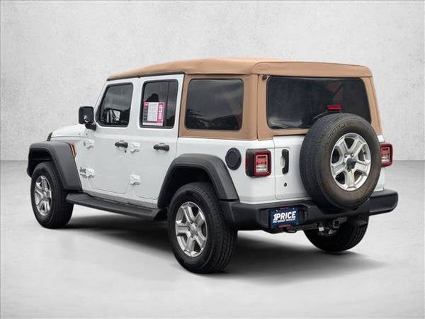 * Transmission: 8-Speed Automatic (850Re) * Premium Tan Sunrider Soft Top * SiriusXM Satellite Radio * Mopar All-Weather Floor Mats * Keyless Start * Convertible Soft Top * Bright White Clearcoat * Engine: 3.6L V6 24V Vvt Upg I W/Ess * Gvwr: 5;300 Lbs * Heritage Tan/Black; Cloth Low-Back Bucket Seats * Tires: 245/75R17 All Season * Wheels: 17" X 7.5" Tech Silver AluminumAutoNation USA Wesley Chapel is excited to offer this 2019 Jeep Wrangler Unlimited Sport S. This Jeep includes: GVWR: 5,300 LBS (STD) PREMIUM TAN SUNRIDER SOFT TOP Convertible Soft Top TRANSMISSION: 8-SPEED AUTOMATIC (850RE) 8-Speed A/T Transmission w/Dual Shift Mode A/T WHEELS: 17 Aluminum Wheels ENGINE: 3.6L V6 24V VVT UPG V6 Cylinder Engine Gasoline Fuel TIRES: 245/75R17 ALL SEASON (STD) Tires - Front All-Season Tires - Rear All-Season SIRIUSXM SATELLITE RADIO Satellite Radio BRIGHT WHITE CLEARCOAT MOPAR ALL-WEATHER FLOOR MATS Floor Mats HERITAGE TAN/BLACK, CLOTH LOW-BACK BUCKET SEATS Cloth Seats Bucket Seats *Note - For third party subscriptions or services, please contact the dealer for more information.* In their original incarnation, SUVs were chiefly owned by folks who valued utility above sport. Not anymore! The Jeep Wrangler Unlimited Sport S redefines the SUV and makes the perfect all around family companion. This 4WD-equipped vehicle will handle beautifully on any terrain and in any weather condition your may find yourself in. The benefits of driving a 4 wheel drive vehicle, such as this Jeep Wrangler Unlimited Sport S, include superior traction and stability. This 2019 Jeep Wrangler Unlimited has such low mileage it has been parked more than driven.