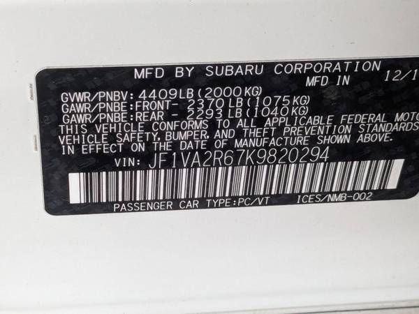 * Leather Seats * Sti Short Throw Shifter (Sti) * Auto-Dimming Mirror W/Compass & Homelink * All-Weather Floor Liners * Rear Bumper Applique * Cargo Tray * Rear Spoiler * Black/Carbon Black; Alcantara Ultrasuede Upholstery * Crystal White Pearl * Standard ModelThis vehicle includes a Money-Back Guarantee* and passed our precise inspection process. Best of all the price you see is the price you pay. No haggling. No back and forth. No pressure. And this price is so good it is guaranteed. *Money-Back Guarantee is valid for 5 days or 250 miles, whichever comes first. Subject to certain terms and conditions. See store for details. Some restrictions apply.