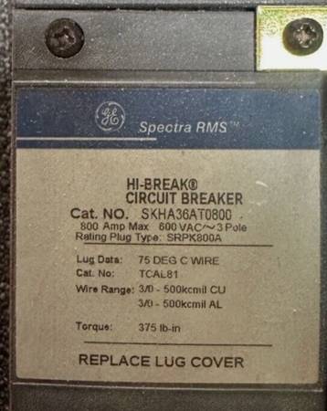SKHA36AT0800 Spectra RMS Circuit Breaker 800A 3P 600V 3PH 800 Amp Frame