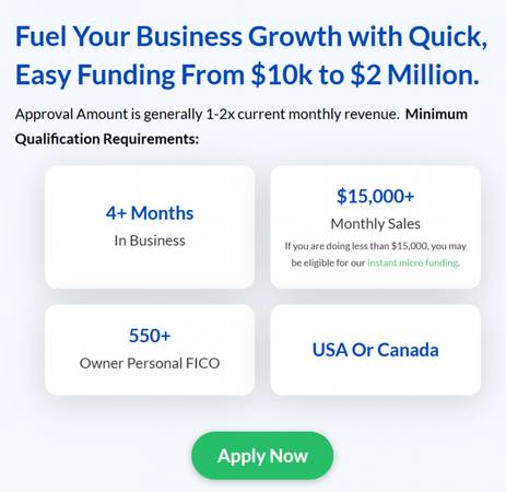 ✅ Have Been In Business at Least 6 Months ✅ Generating at Least $15,000 in Monthly Sales Revenue ✅ FICO score of 550 or higher