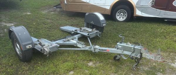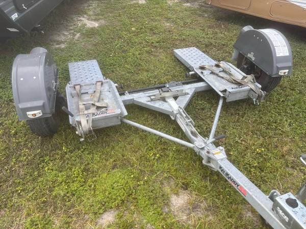 Demco Kar Kaddy 9713049 is a high-quality, tow dolly designed for up to 4,700 lbs towed vehicle weight, steerable axle and foldable design for easy storage and maneuverability behind an RV.