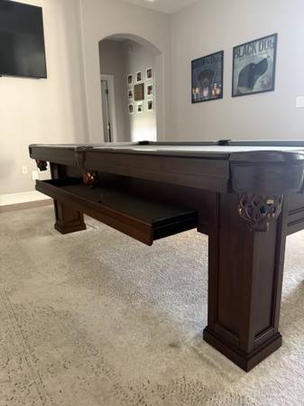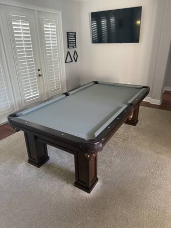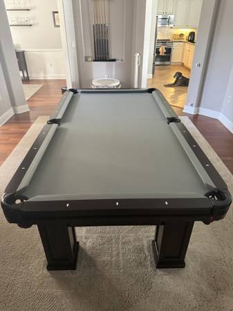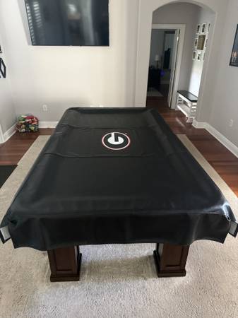 Brunswick Oakland II 8' pool table with gray Centennial stain-resistant cloth. This table has done a great job at keeping my rug from flying away over the years, but I think it's finally time to let it go. Only used a handful of times and has stayed covered otherwise. Table was purchased new. Includes 4 cues, bridge, set of balls, triangle/diamond racks, and a cover (+$300 if you want me to cover up the Georgia logo on it). This table weighs as much as a baby elephant, so buyer will be responsible for moving it. Price is $3400 total if you'd prefer to have me arrange for it to be professionally disassembled and relocated/set up within 100 miles of Clermont, FL.