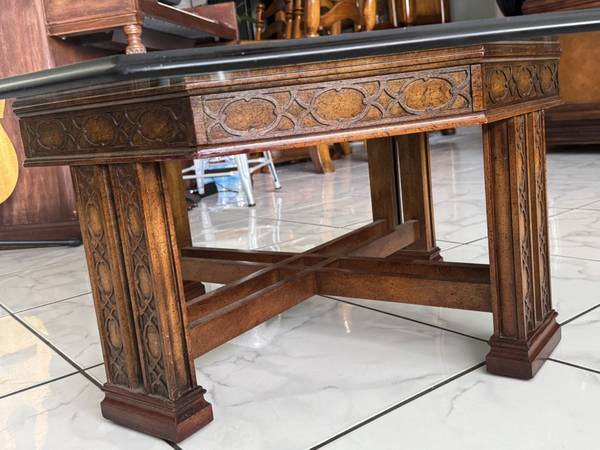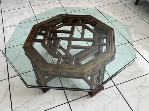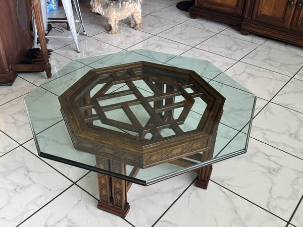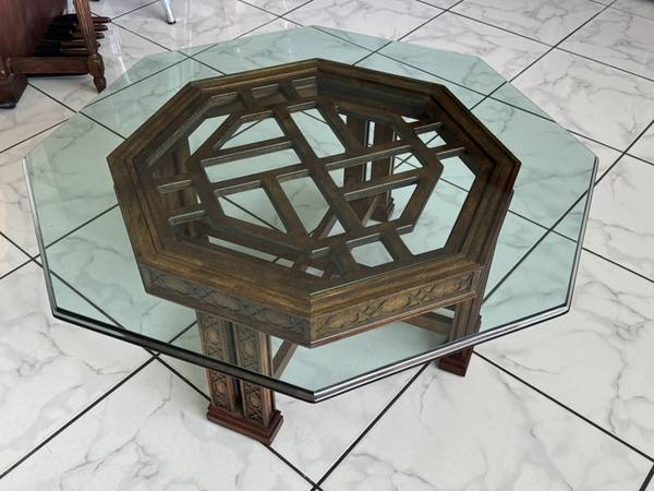 A beautiful Chinese Heritage Octagon Center or Dining Table w/Glass, Vintage. It has a small scratch on one side of the glass but not discoverable until you look very closely. Glass is very heavy and recommend two strong men to carry it back to the vehicle. Please bring your own protective moving blankets to place the glass safely on vehicle.