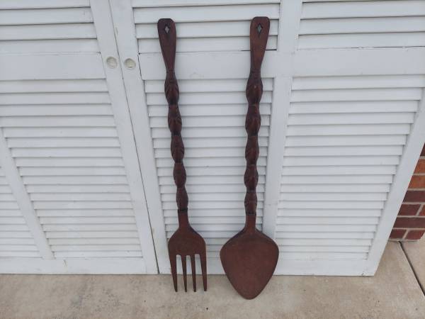 Mid Century Extra Large Folk and Spoon - Beautiful Tiki Carved Handles - These Are in Great Vintage Condition - Attention Tiki Collectors. Measures 41 1/4" Long x Folk 6" Wide and Spoon 9" Wide. Price $125.00. Cash Only. For More Info Call 386 eight four eight six two two 4 or Texts.
