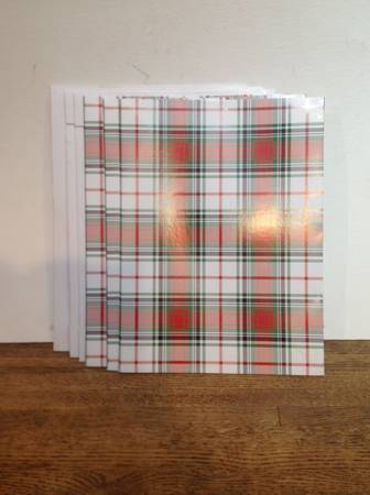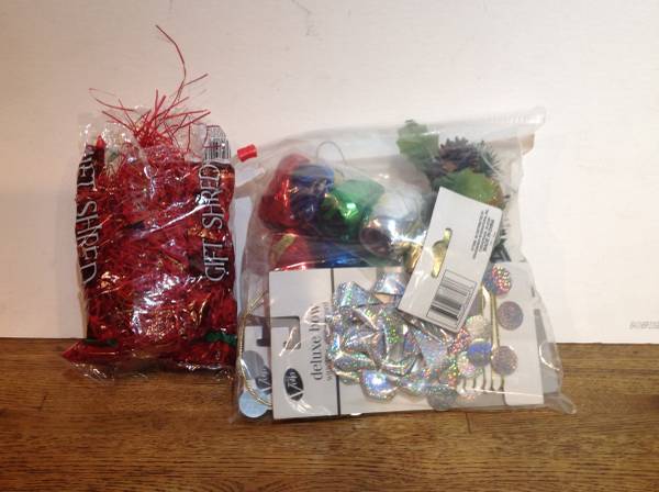 gift shred red and gold barely used, ribbons and bows like new .50 cents each blue streamer 150' x 1.75", new .50 cents 3 small plaid cardboard boxes, new $1 each gift tissue paper new, traditional...
