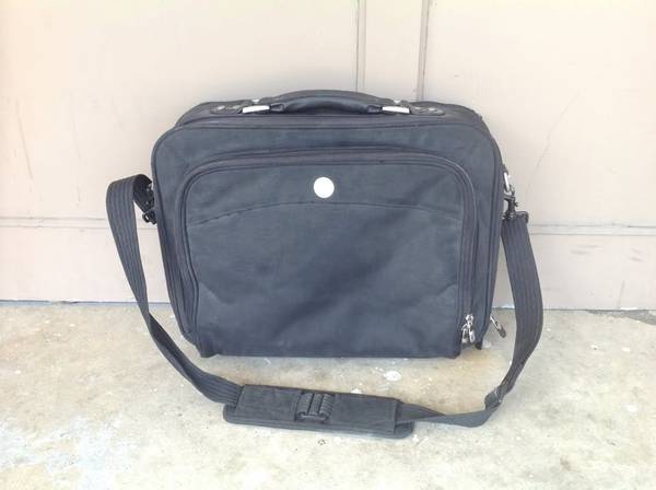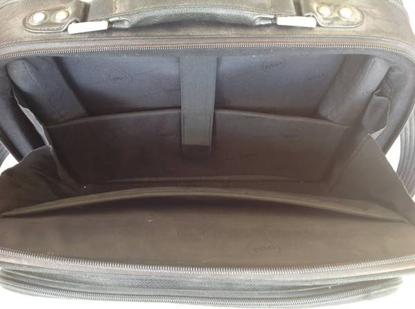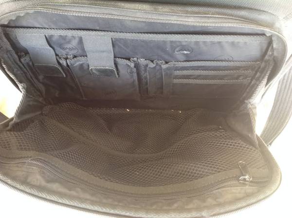 black laptop and office case by Dell, comes with shoulder strap, all zippers work, 4 main compartments, compartment 1 holds office supplies and 2 small mesh zipper pouches, compartment 2 holds files and laptop, compartments 3 holds files, compartment 4 for storage, some wear