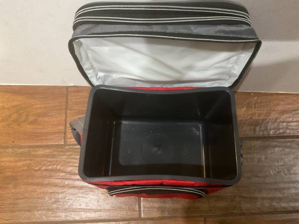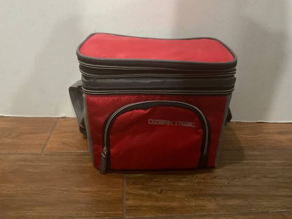 small red cooler by ozark trail, has shoulder strap, has 1 cooler main compartment and 2 cooler pouches, zippers all work, 9” x 6” x 8.5”, hardly used