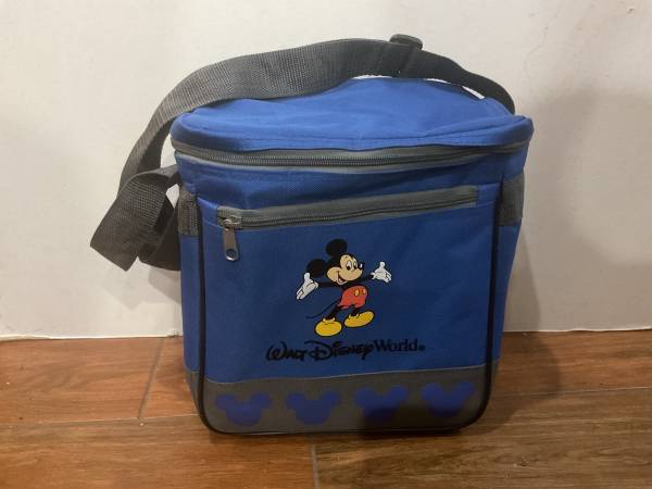 blue and grey small cooler by Disney, has shoulder strap, 1 exterior zipper pouch, 1 main compartment, 10” x 5” x 10.5”, hardly used