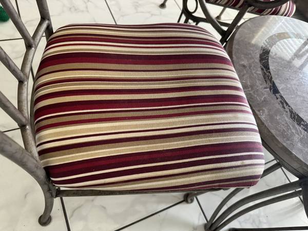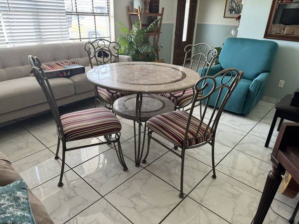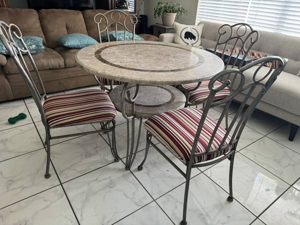 This is a beautiful Marble table and 4 dining chairs. The metal chairs and table are all aluminum . Measures 42 inches in diameter by 30 inches tall.