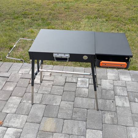 34"D x 16.99"W x 31"H All steel grill support table that folds down into a large briefcase sized package.
