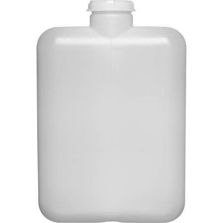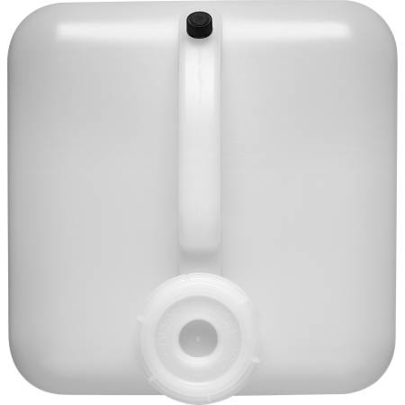 This 5-gallon (20-liter) natural high-density polyethylene (HDPE) plastic rectangular tight head container has a 70mm (8TPI) neck finish and a fixed handle.