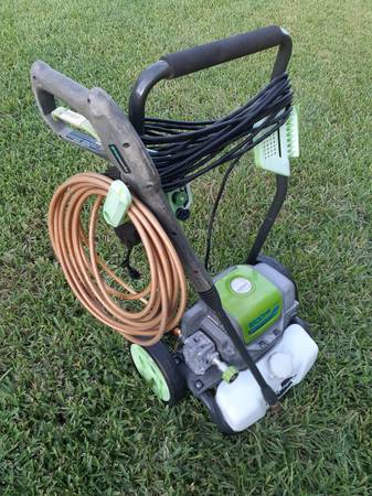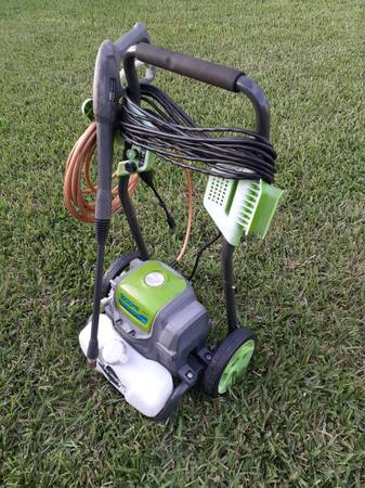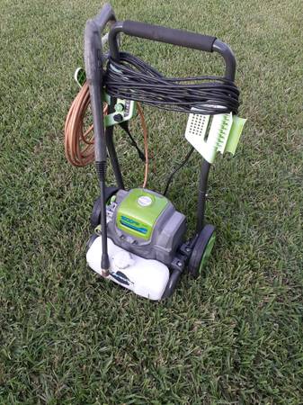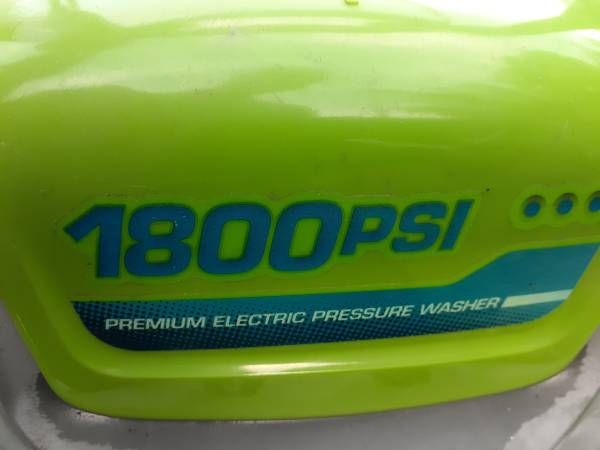 Greenworks 1800 psi. electric pressure washer. Connects to standard 120v outlet. Includes hose, wand and nozzles. Simple and easy to use. Excellent condition. $65.