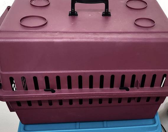Small pet carrier in good condition. Secure metal door, plenty of ventilation, and includes an attachable food/water cup. Great for cats or small dogs for travel or vet visits.