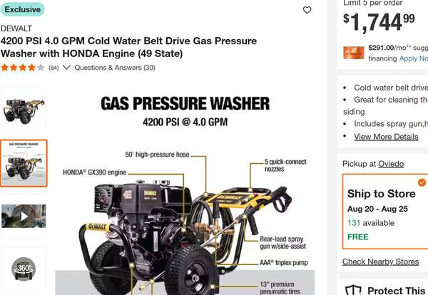 As explained above, my pressure is in new condition with only 8 hours on it. If you want a brand new model of the exact model, Home Depot is charging $1,1744.99, not including tax. There is nothing wrong with this pressure washer, other than it's too much for me to handle.