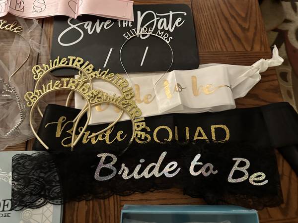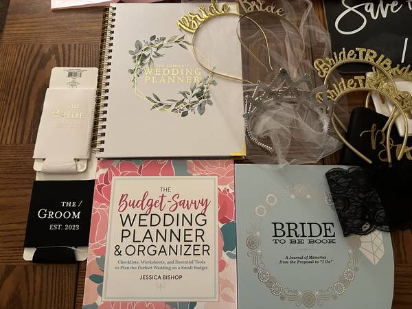 For Sale 50.00 OBO 3 different wedding planner books Bridal headband and sashes a wedding ring pillow. like new