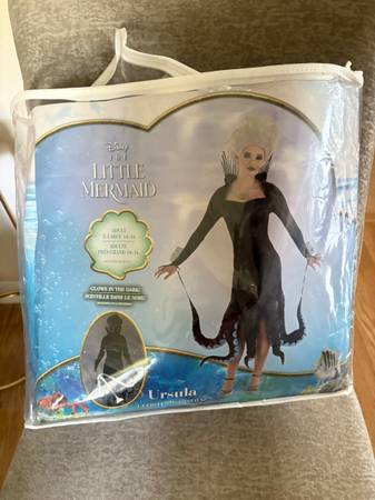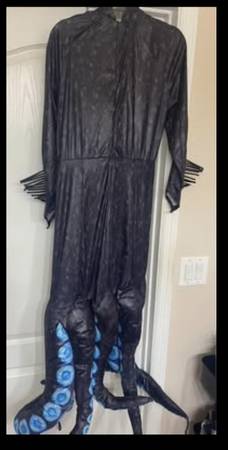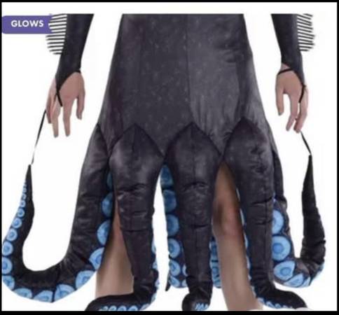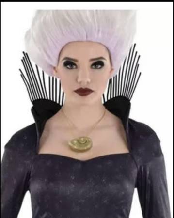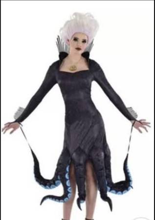Dress up for a night of magic and trickery with this Ursula Costume. The printed black dress features a high collar that's covered in spikes, matching spikes along the arms, and of course, eight curled tentacles that make up the bottom hem.