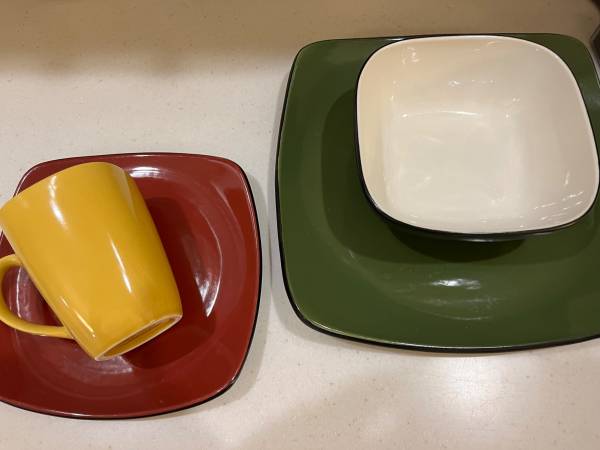 Very nice condition Corelle Hearthstone stoneware set of dishes. Various colors: Chili Red, Bay Leaf Green, Turmeric Yellow, Royal White. Various colors and sizes. 35 total pieces. 10 dinner plates...