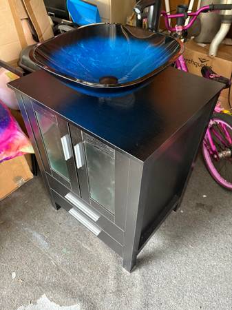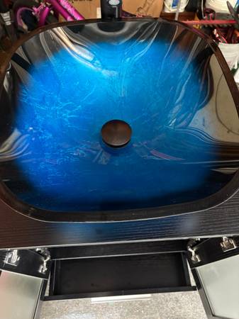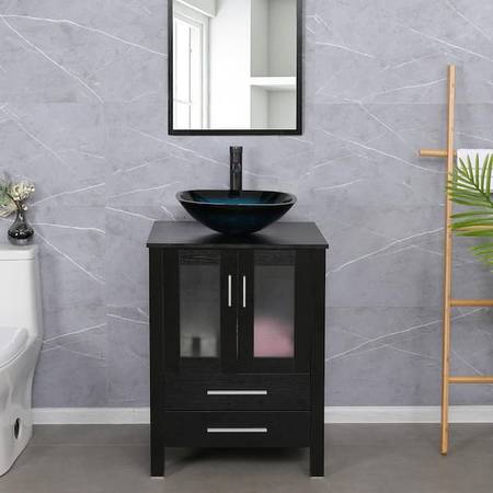 Urban and luxurious, this eclife 24 in. Bathroom Vanity and Vessel Sink set adds a contemporary vibe and practical storage to your bath. The collection's contrasting textures include a panel shelf and smooth wood grid tops. Cupboard doors with 2 drawers and large storage space are very suitable for your bathroom. Handcrafted from tempered glass by skilled artisans, each of the vessel sinks is a functional work of art that complements the transitional and modern bathroom alike. The high-quality tempered glass/ceramic are very easy to clean and keep bright for long-lasting beauty. Coupled with a faucet, this basin will be an astonishing focal point to refresh your bathroom. Recommended to you.