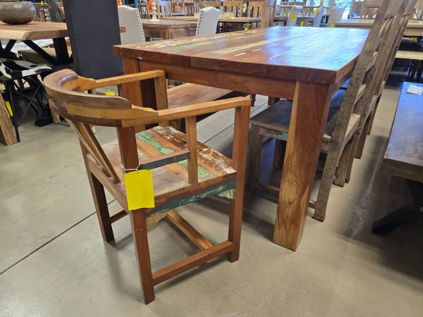 This stunning dining table features a unique and vibrant reclaimed wood plank tabletop, making it a true centerpiece for any dining space. The top is composed of multiple wood planks with distressed, multi-colored paint accents in shades of blue, teal, yellow, and white/cream, providing a beautiful, rustic, and colorful texture.