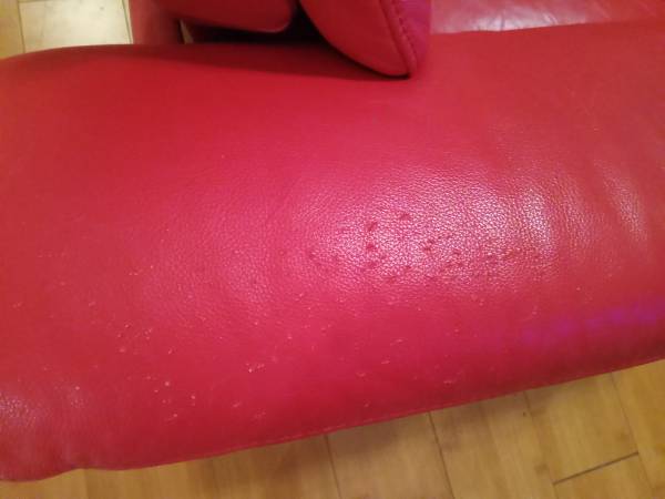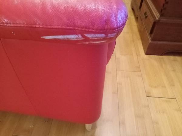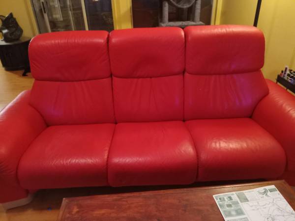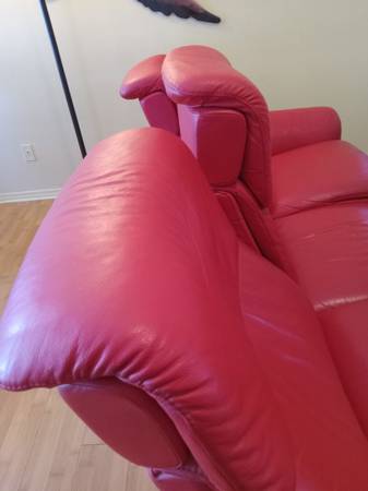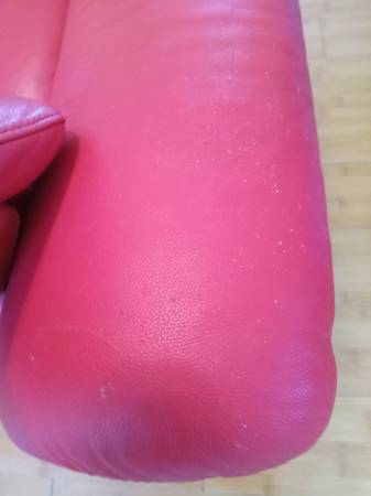 PRICE DROP!!!! Red leather sofa with 3 sections. Each section reclines back but does not have a foot rest. Shows wear and tear. Does have a paint stain on right arm and marks on seats (see pictures). Just cleaned with leather cleaner but slightly darker where you sit down. Oak feet. Measures 86 inches wide x 40 inches high x 32 inches deep and arms are 22 inches high.