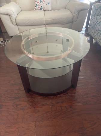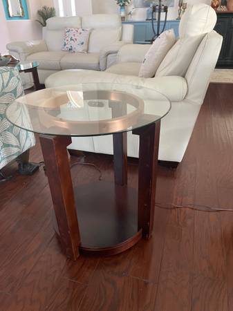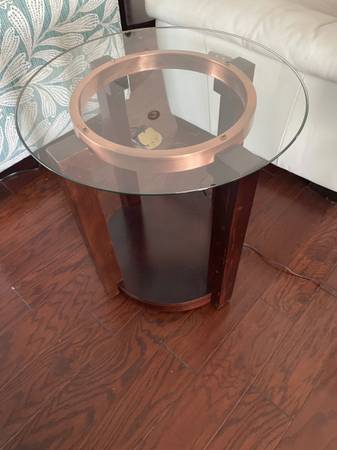 Very nice transitional or modern look glass/wood/copper Coffee and End Tables. Wood base. Solid and sturdy.