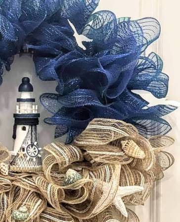 "ALL ABOUT WREATHS" & MORE! .. ❤️ GORGEOUS LIGHTHOUSE WREATH $50 18" INCH, HANDCRAFTED WITH A BURLAP BACKING & HANGER CLIP FOR EASY HANGING! ABSOLUTELY GORGEOUS!! CALL OR TEXT DONNA SHIPPING...