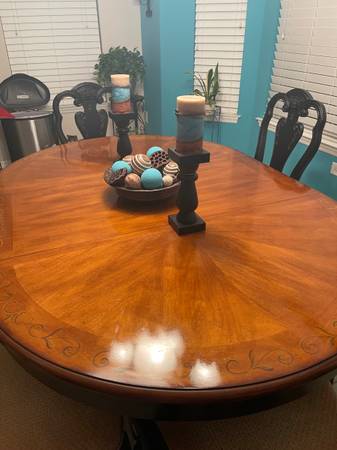 Beautiful dining table, includes leaf, single pedestal solid wood table with 6 cushion chairs. Excellent piece of furniture. Solid and Sturdy. Plus kitchen Island Cabinet. Located in Clermont Florida