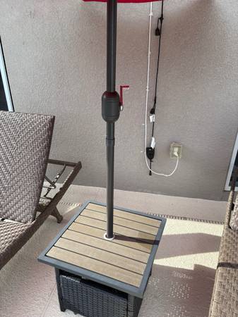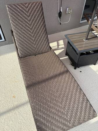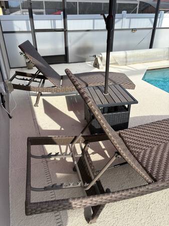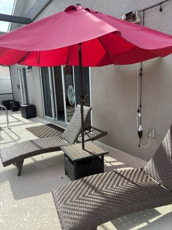 Pickup only-no delivery Set of two wicker chaise lounges with a side table and red umbrella, perfect for patio relaxation. In good condition Moving and must sell. Will accept cash only! Located off...