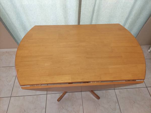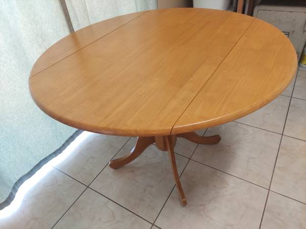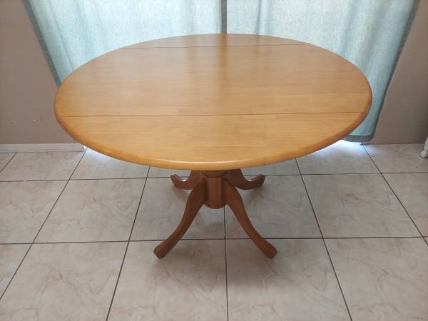 42" Round Drop Leaf Pedestal Table - Brand New Out of Box 📦 - Never Used - Just Assembled Hours Ago - Lovely Natural Wood Finish - Hardwood - Has Foot Adjustables For Uneven Floors - Measures 42" Diameter x 25 1/2" with Leaves Down and 30" Tall. Price $120.00. Cash Only. For More Info Call 386 eight four eight six two two 4 or Texts.
