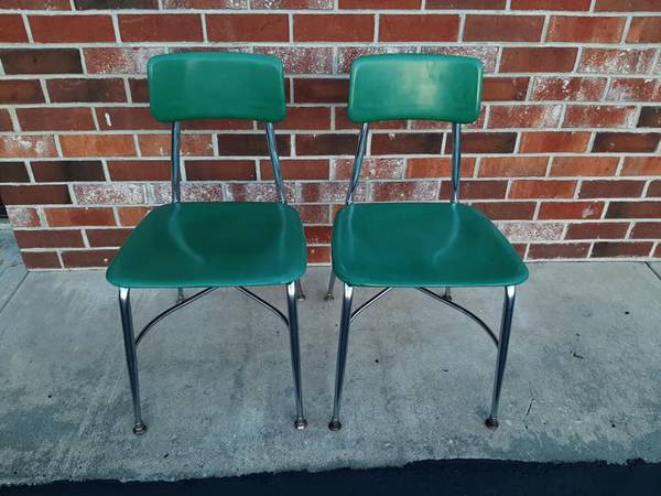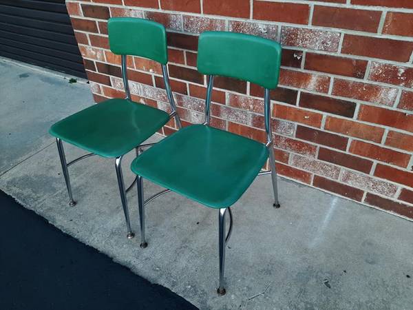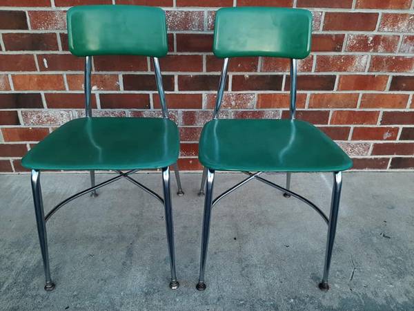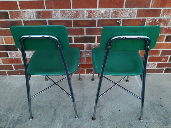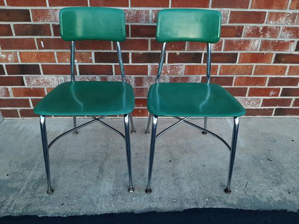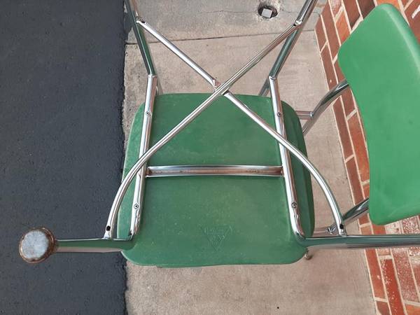 Mid Century Pair of Heywood Wakefield Chrome and Plastic Chairs - Very Good Original Condition - Green Color - Chrome Fine Condition No Rust - Marked Woodie Solid Plastic. Measures 16 1/2" Wide x 18" Depth and 30 1/2" Tall. Seat 16 1/2" Tall. Price $95.00. Cash Only. For More Info Call or Texts 386 eight four eight six two two 4. Not Emails.