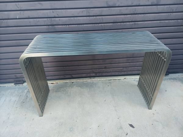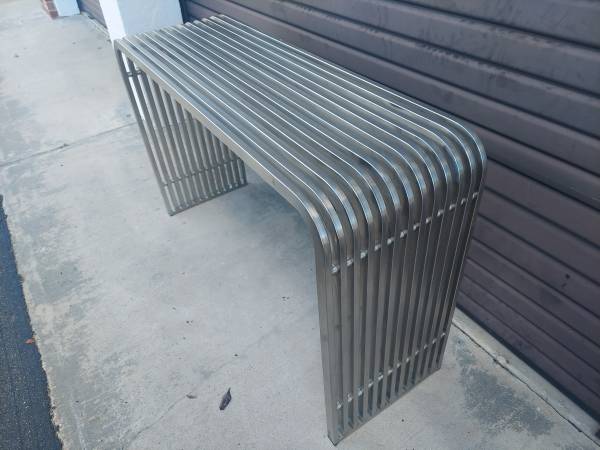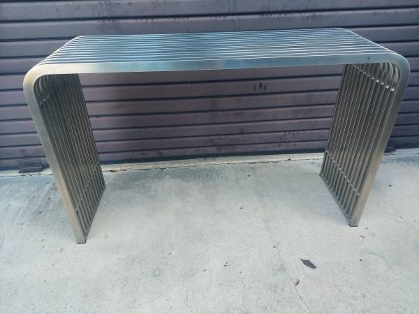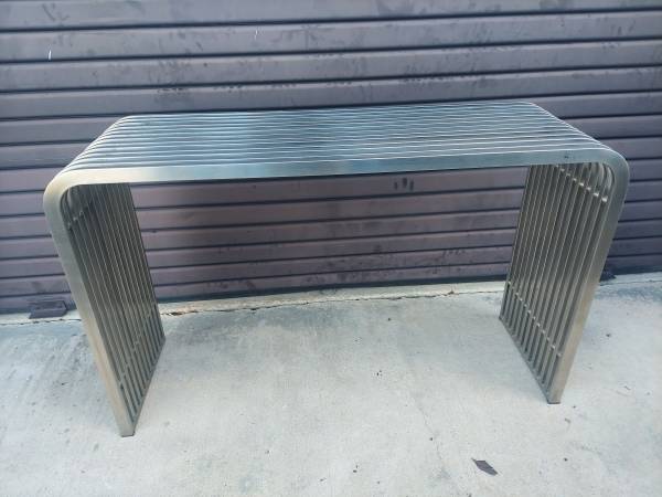 Modern Stainless Steel Console Table Silver Stripe 13 Stainless Pipes Evenly Spaced - Beautiful Curved at Top - Add Elegance to Your Decor with This Stunning Table - In Very Good Original Condition - Measures 46 1/2" Long x 15" Depth and 29" Tall. Price $500.00. Cash Only. For More Info Call 386 eight four eight six two two 4 or Texts.