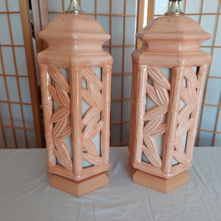 Pair of Vintage Ceramic Table Lamps Feature Faux Bamboo Detailing and Lights within the Body. Can Be Lit with Either the Main Bulb, the Body, or Both. Very Good Original Condition with No Cracks or Chips. As with All Vintage- Soft Pink or Salmon Color - From Non Smoking Home. Measures 7" Wide x 8" Depth and 22" Tall. Price $250.00. Cash Only. For More Info Call 386 eight four eight six two two 4 or Texts.
