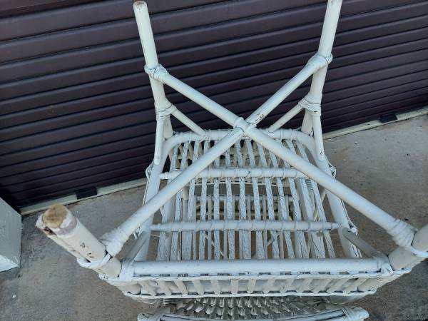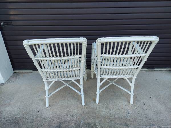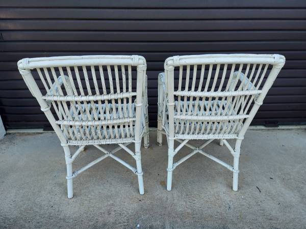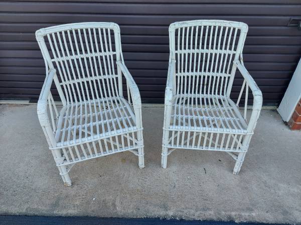 Pair of Vintage Porch Armchairs with Bentwood Frame and Wicker / Rattan Seats and Backs and Decorative Trim - Great Vintage Look and Condition - Strong and Sturdy - Many Layers of White Paint with Some Chipping - Includes 2 Blue Cushions - May Have Some Imperfections Due to Age and Use - From Non Smoking Home. Measures 21 1/2" Wide x 19" Depth and 34 1/2" Tall. Seat 16" Tall without Cushions. Price $170.00. Cash Only. For More Info Call 386 eight four eight six two two 4 or Texts.