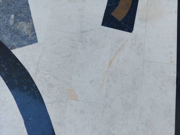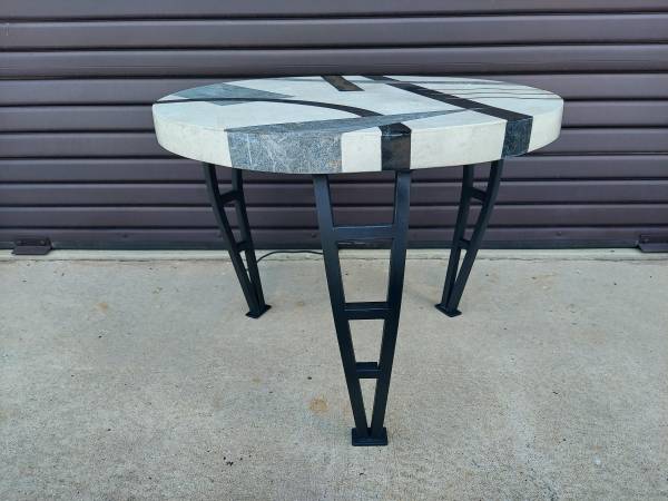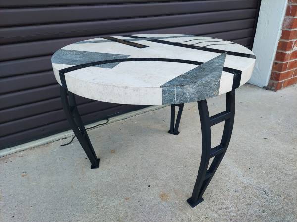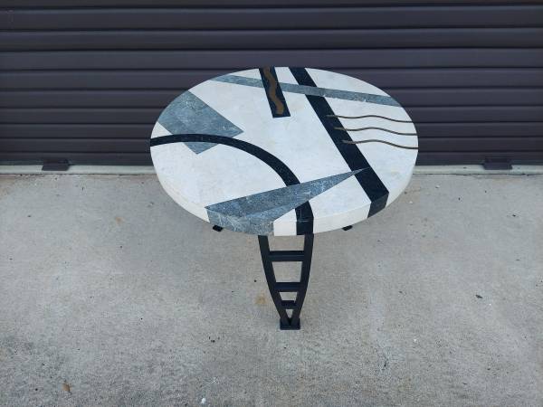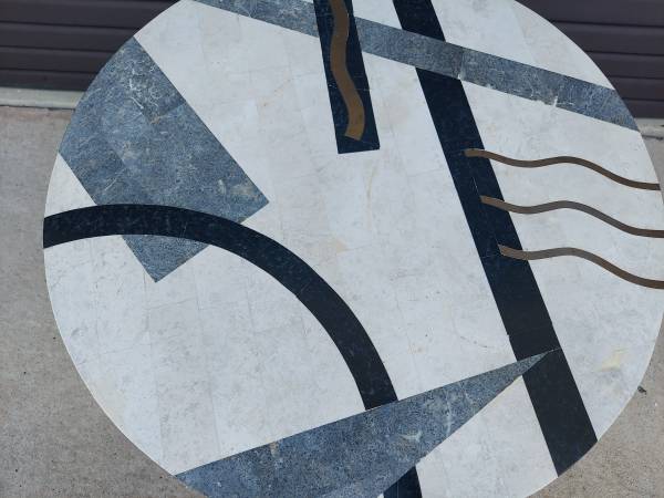 Post Modern Tavola Oggetti Style Memphis Table - Tessellated Marble in Geometric Shape with Brass Inlay with Metal Legs - Good Original Condition Unaltered - Some Imperfections Due to Age and Use - From Non Smoking Home. Measures 27 3/4" Round x 22" Tall. Price $195.00. Cash Only. For More Info Call 386 eight four eight six two two 4 or Texts.