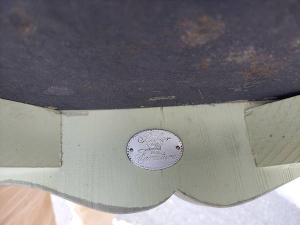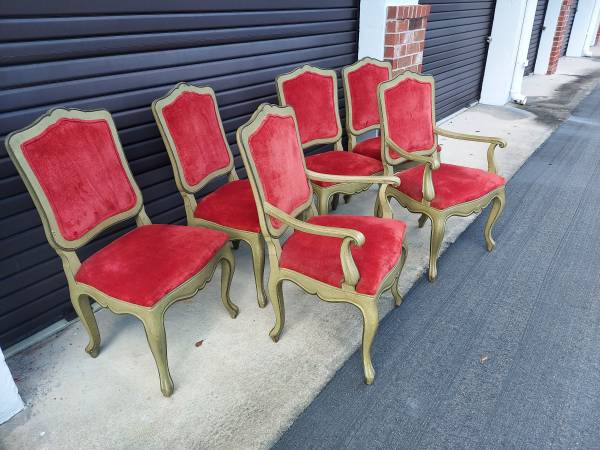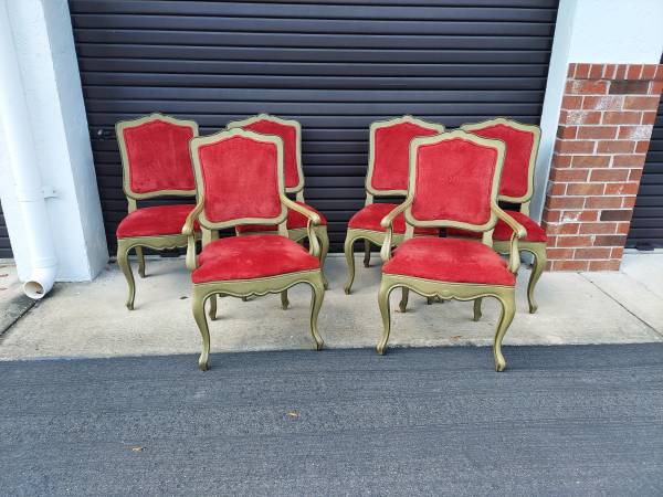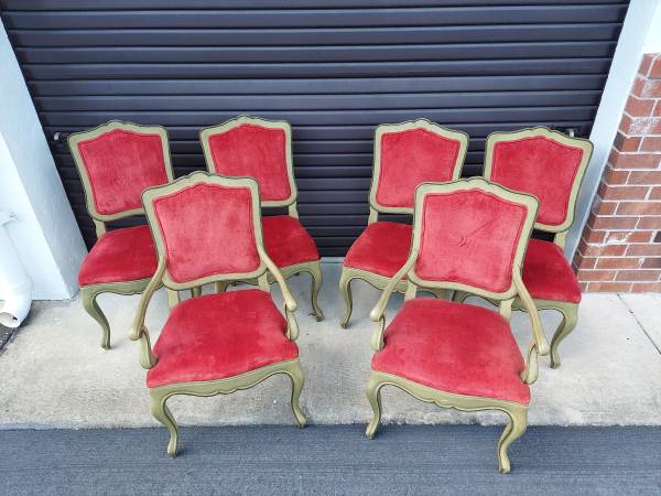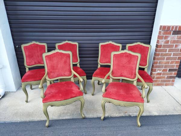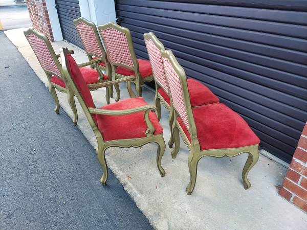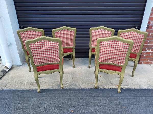 Set of 6 Vintage Country French Dining Chairs By Baker Furniture - In Original As Found Condition - Soft Green with Darker Green Outline Trim and Red / Orange Upholstery - Chair Backs Have Red and Green Plaid - Metal Baker Furniture Label on Each Chair - Great gently Used Vintage Condition - May Have Minor Imperfections Due to Age and Use - From Non Smoking Home. Measures Armchairs 22" Wide x 19" Depth and 37 1/2" Tall. Arm 25" Tall. Seat 18" Tall. Side Chairs 20" Wide x 17" Depth and 37 1/2" Tall. Seat 18" Tall. Price $500.00. Cash Only. For More Info Call 386 eight four eight six two two 4 or Texts.