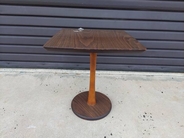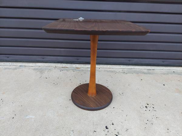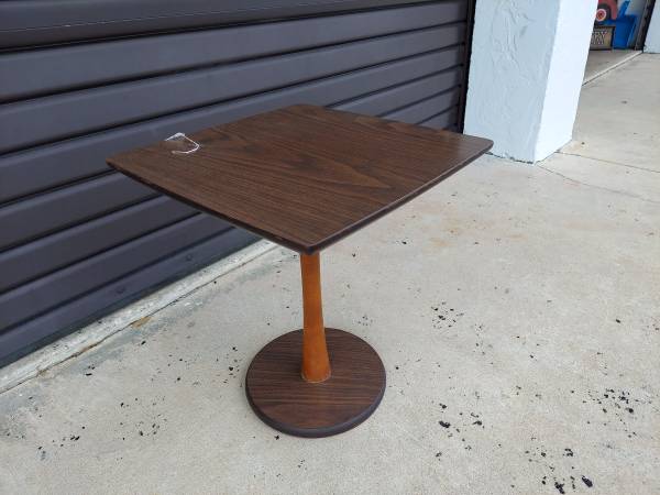 Small Mid Century Occasional Table - Wood Grain Laminate Top - Very Good Original Condition. Measures 10" Round Base 15 1/2" x 15 1/2" Square and 17 1/4" Tall. Price $60.00. Cash Only. For More Info Call or Texts 386 eight four eight six two two 4. Not Emails.