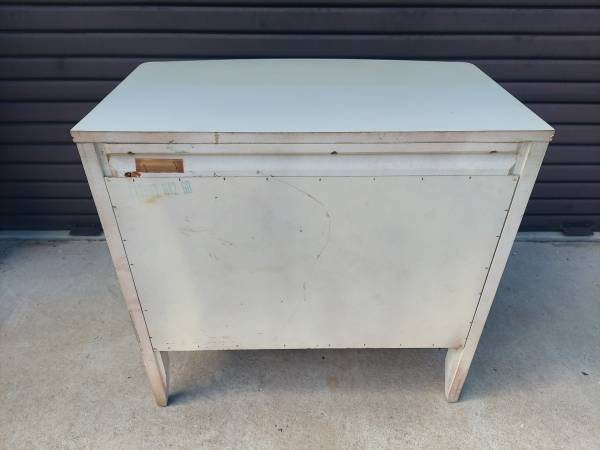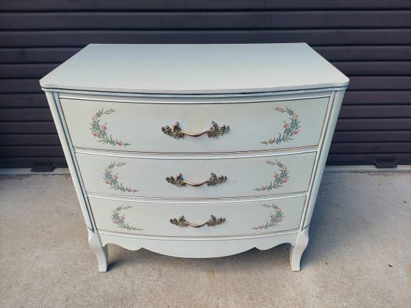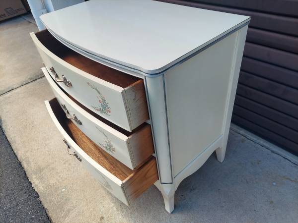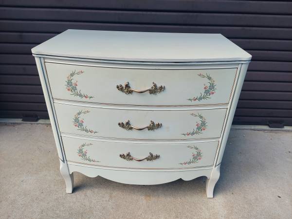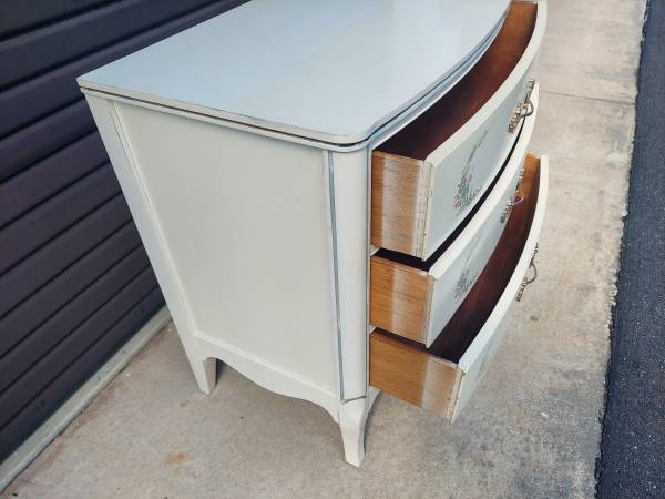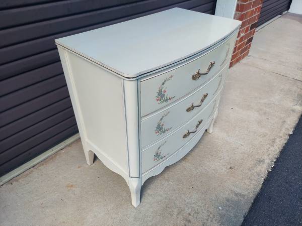 Vintage Cottage Style Solid Wood Chest with 3 Dovetailed Drawers - Nice Vintage Condition - Original Painted Florals on Drawer Fronts and Large Solid Brass Pulls - Some Distressing Due to Age and Use - All Drawers Work Easily. Measures 3" Wide x 18 1/2" Depth and 30 3/4" Tall. Price $145.00. Cash Only. For More Info Call 386 eight four eight six two two 4 or Texts.