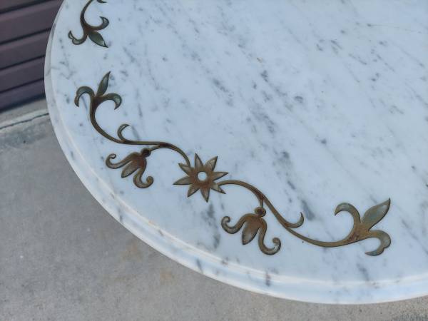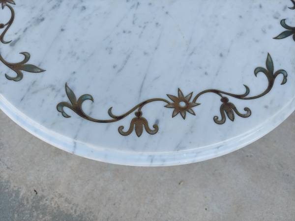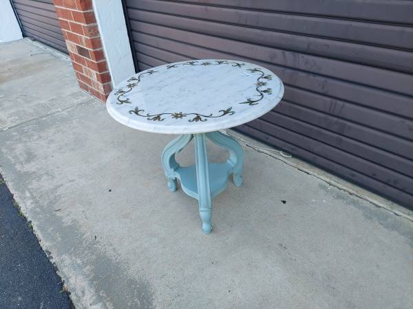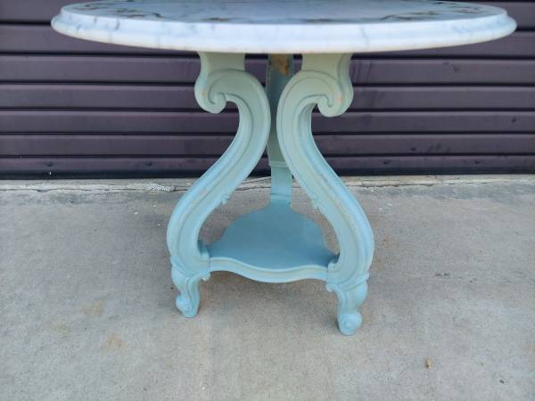 Vintage Italian Marble Top Side Table - Light Blue Wooden Base - Beveled Edge Marble Top with Floral Carving - Nice Vintage Condition - From Non Smoking Home. Measures 24" Round x 22" Tall. Price $95.00. Cash Only. For More Info Call or Texts 386 eight four eight six two two 4 . Not Emails.