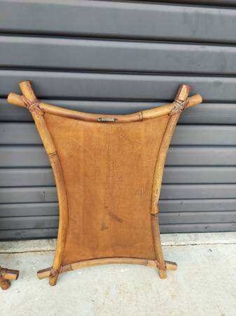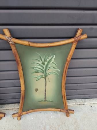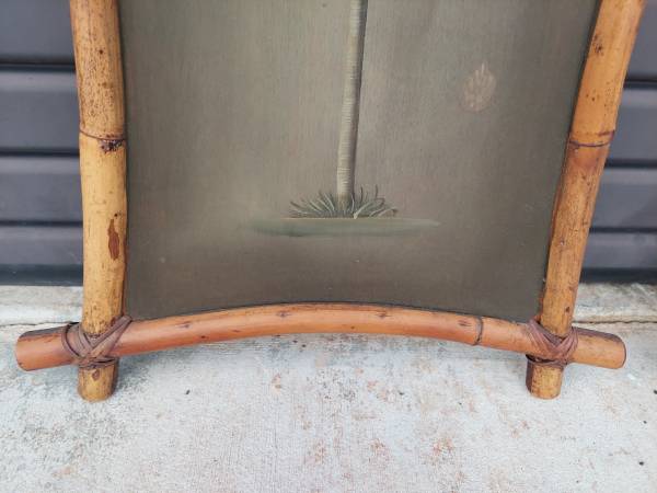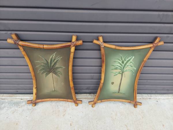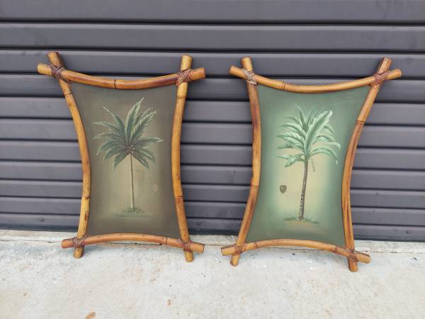 Vintage Pair of Bamboo Frame Palm Tree Paintings on Board in Bent Bamboo Frame with Reed Wrapped Corners - Very Good Vintage Condition - Maybe Minor Imperfections Due to Age and Wear - From Non Smoking Home. Measures 19 1/2" Width x 1 1/2" Depth and 27 1/2" Tall. Price $875.00. Cash Only. For More Info Call 386 eight four eight six two two 4 or Texts.