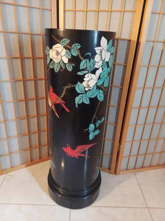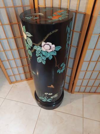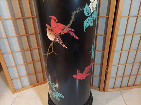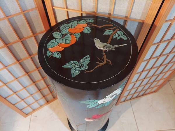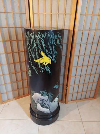 Vintage Round Chinoiserie Lacquered Pedestal Decorated with Birds and Flowers - This Lovely Decorative Item is in Good Gently Used Condition with Vibrant Colors and Nice Original Finish - Top Edge Has Minor Wear Due Age and Use - From Non Smoking Home. Measures 36" Tall x 12" Overall x 13 1/2" Base. Price $225.00. Cash Only. For More Info Call 386 eight four eight six two two 4 or Texts.